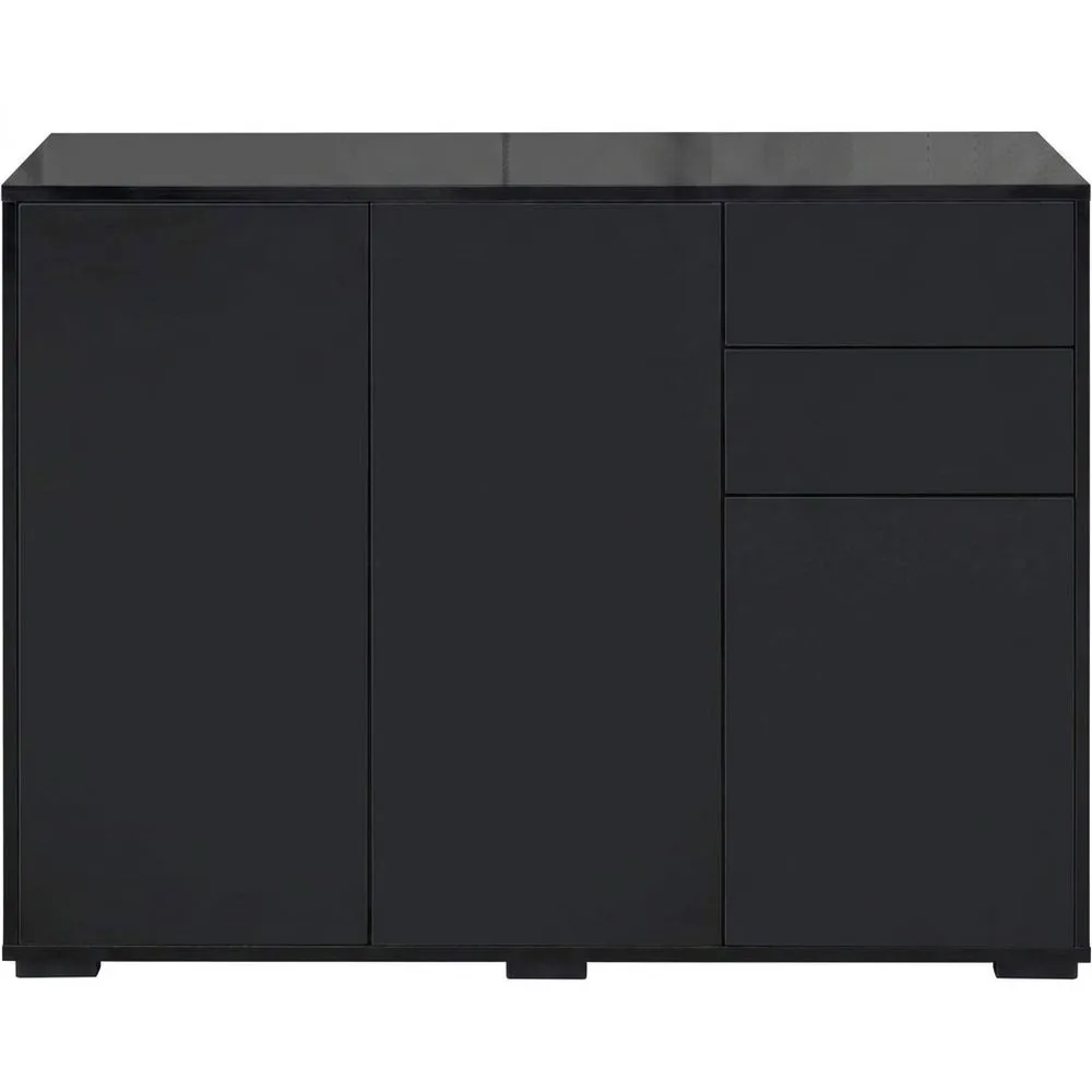 Combinación de acabados con efecto mate y brillante en el aparador. El contraste entre el frente mate y el brillo de la parte superior y los laterales aporta un toque distintivo. Espacio amplio y apertura sencilla: El aparador cuenta con 2 cajones, 2 armarios con puertas y una encimera espaciosa. Incluye un estante ajustable y un diseño de apertura por presión para puertas y cajones. Versatilidad: Ideal para almacenar libros, ropa, platos, cubiertos, entre otros. Utilizable en sala de estar, comedor, dormitorio, baño y más. Fabricado con melamina de madera resistente. Incorpora un sistema anti-vuelco para fijar a la pared y evitar que el mueble se vuelque.