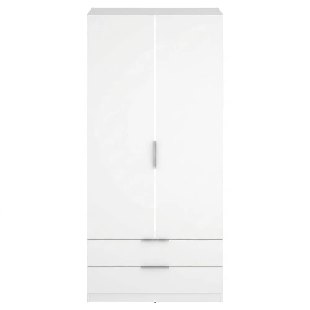 El armario de 2 puertas y 2 cajones en blanco ofrece un diseño contemporáneo y funcionalidad práctica. Con una altura de 203 cm, optimiza el espacio vertical. El interior dispone de barras para colgar y estantes ajustables, mientras que los dos cajones inferiores facilitan la organización de ropa doblada o accesorios de uso frecuente. Incluye dispositivo para fijar a la pared para mayor seguridad y tacos de ABS que protegen el suelo y reducen el ruido.