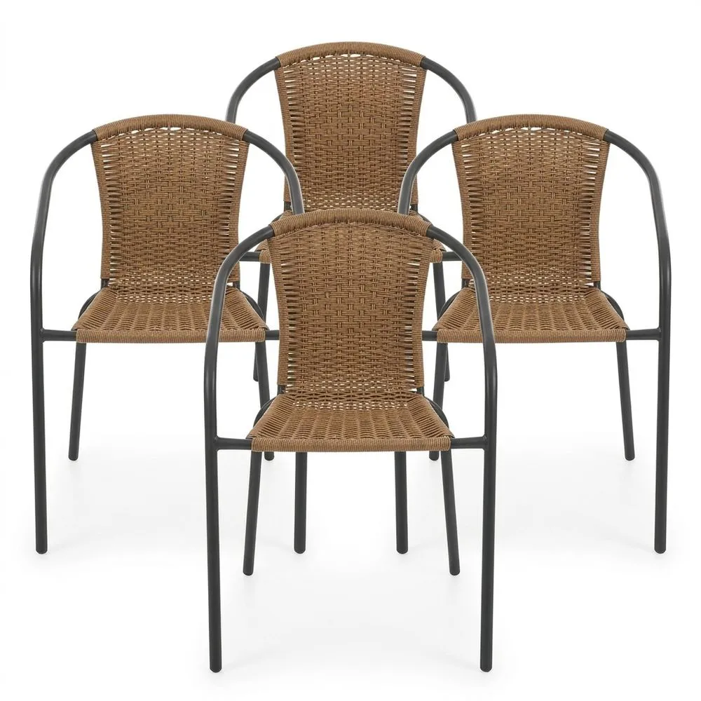 Este pack incluye 4 sillas de jardín apilables con diseño ergonómico y respaldo envolvente. Están hechas con una estructura tubular metálica de acero de Ø 22mm, con un acabado en color gris antracita. El asiento y el respaldo están fabricados con cuerda técnica trenzada de rattan PE en color natural. Las dimensiones de cada silla son 52 cm de largo, 72 cm de alto y 61 cm de ancho. Las sillas han sido tratadas con resina Epoxi para mayor resistencia a la corrosión, adecuadas para su uso en exteriores. Permiten un apilamiento sencillo y cuentan con topes niveladores para el suelo, lo que las hace adecuadas para diversos ambientes. Proporcionan una sensación de frescura al dejar pasar el aire, resultando útiles para el jardín, balcón o terraza.