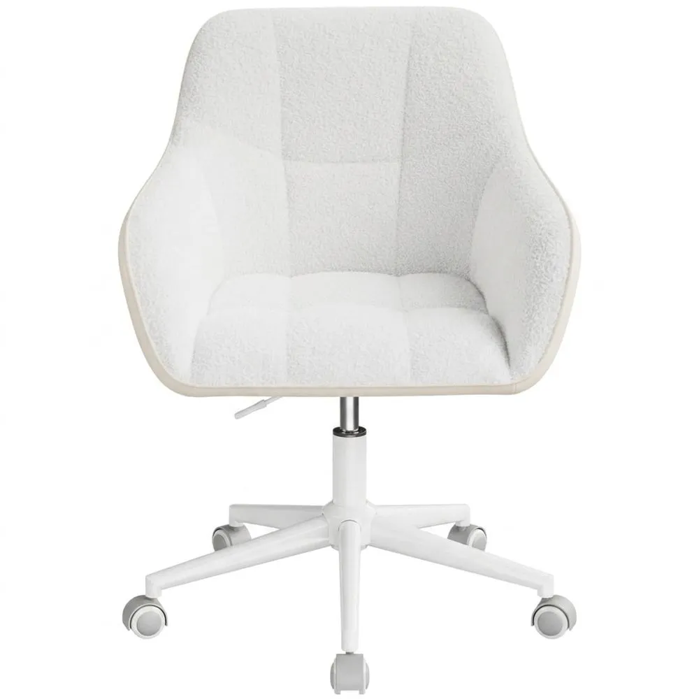 SILLA DE OFICINA ERGONÓMICA: El respaldo y los reposabrazos están diseñados en una sola pieza y se inclinan ligeramente hacia afuera para ofrecer soporte al cuerpo. ASIENTO ACOLCHADO: Superficie de cachemira artificial que proporciona una sensación suave al tacto. El acolchado de espuma es resistente y mantiene su forma. DISEÑO MODERNO: La silla cuenta con una estética que permite su uso en diferentes entornos como oficina, sala de estar o tocador. Los distintos colores y materiales en la silla mejoran su apariencia. AJUSTE DE ALTURA Y ROTACIÓN 360: La altura del asiento es ajustable entre 48-57 cm para adaptarse a diversas necesidades. La funcionalidad de rotación y las ruedas universales permiten un movimiento flexible. ESTABILIDAD: La base metálica es resistente y proporciona una gran capacidad de carga de hasta 150 kg. Las ruedas silenciosas de PU protegen el suelo.