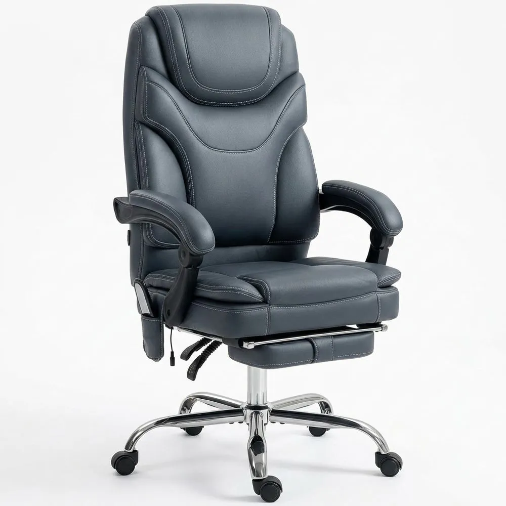 Esta silla de oficina cuenta con función de masaje de seis puntos y calefacción lumbar, diseñada para reducir la fatiga corporal. Controla las funciones con el mando a distancia disponible. El respaldo se puede reclinar hasta 135 grados y cuenta con un soporte para pies, ofreciendo una sensación de confort. La silla ofrece un respaldo alto que cuida el cuello y la espalda, con apoyabrazos acolchados. Está tapizada en cuero sintético para una limpieza sencilla. La altura de la silla es ajustable para adaptarse a diferentes necesidades y el elevador de gas certificado por TÜV aporta estabilidad. Las ruedas de PU son adecuadas para distintos tipos de suelo.